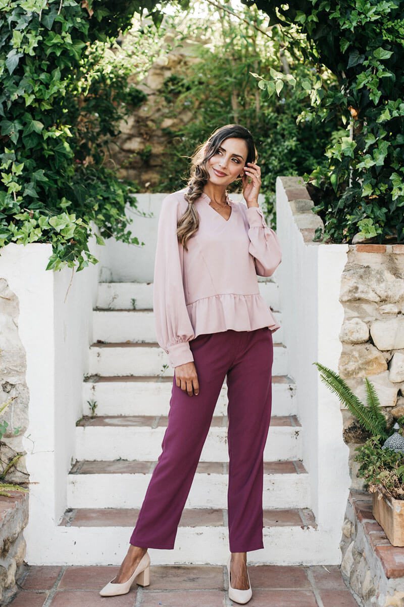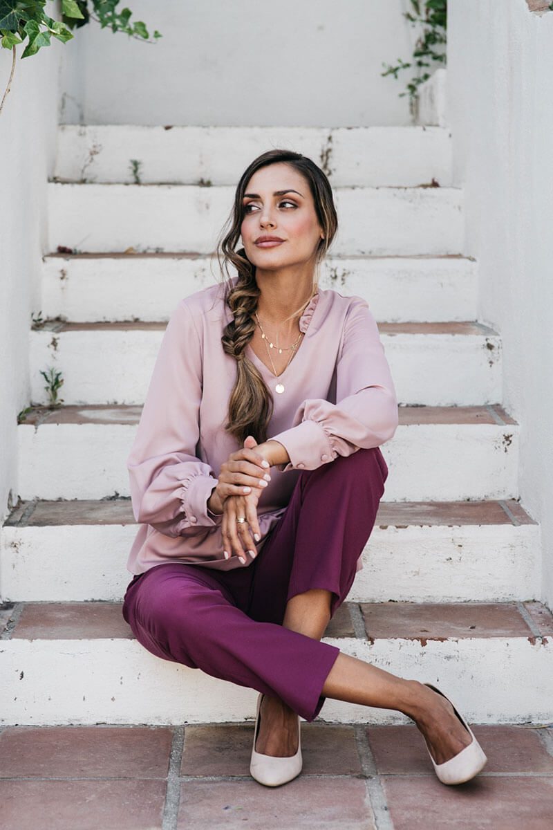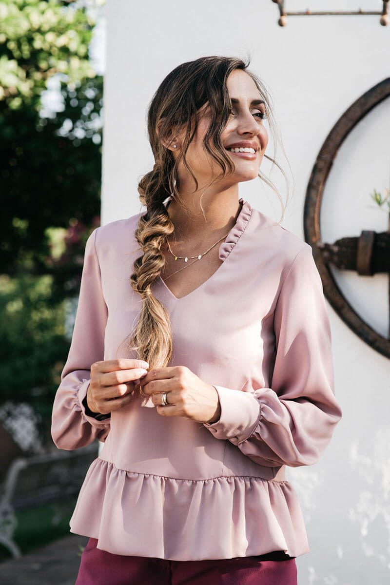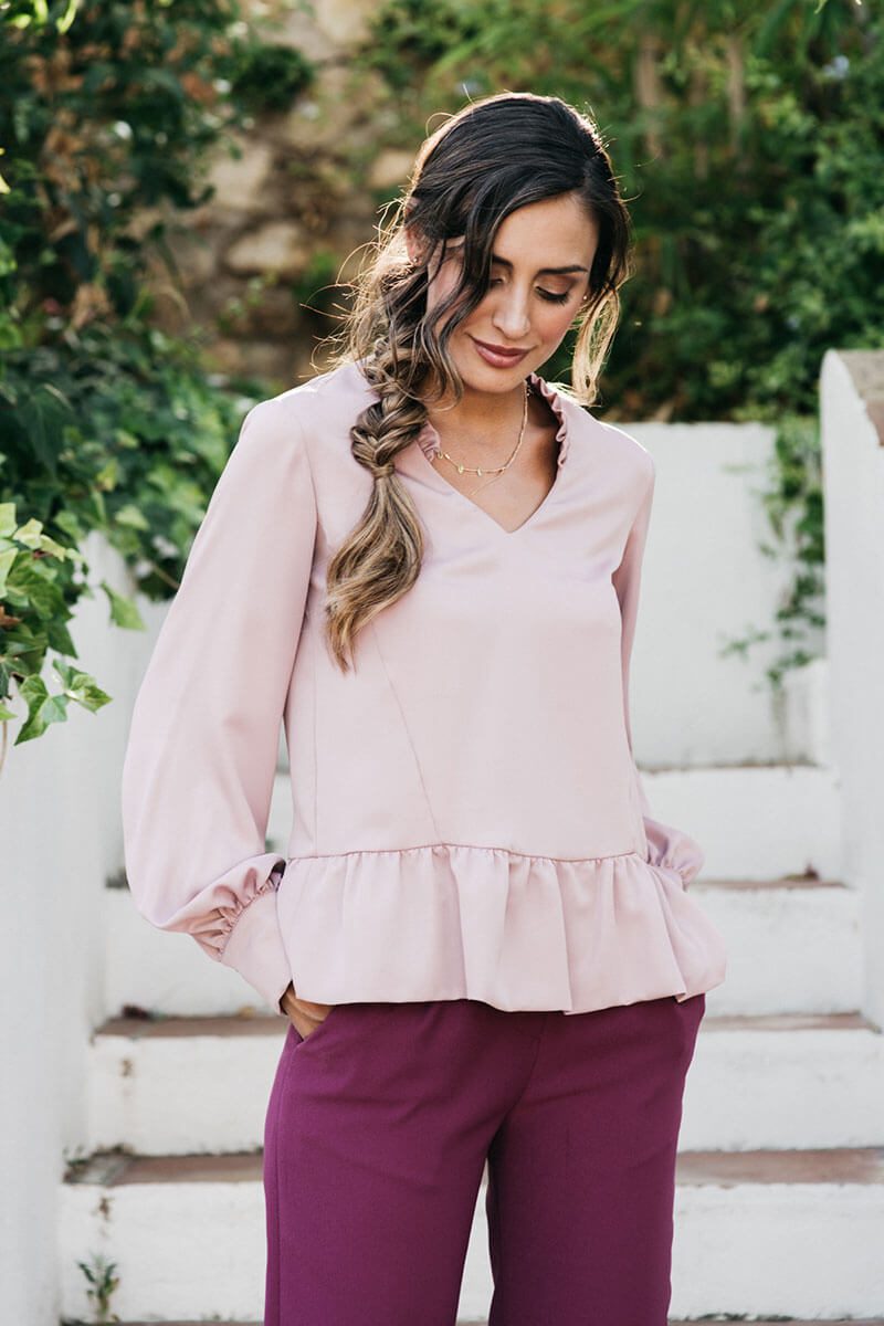 La blusa Feminity es suelta, de largo hasta la altura de las caderas, con manga larga y cuello de pico. Su escote en forma de “V”, además de ser el más favorecedor, está decorado con un volantito en versión mini que aporta un toque muy original a la prenda. Su manga es suelta, fluida y con volumen en la parte de abajo, donde termina con un puño de tejido doble que se cierra con dos botoncitos forrados del mismo tejido de la prenda. La blusa acaba con un volante rizado en el bajo lo que aporta aún más fluidez y soltura a la prenda.