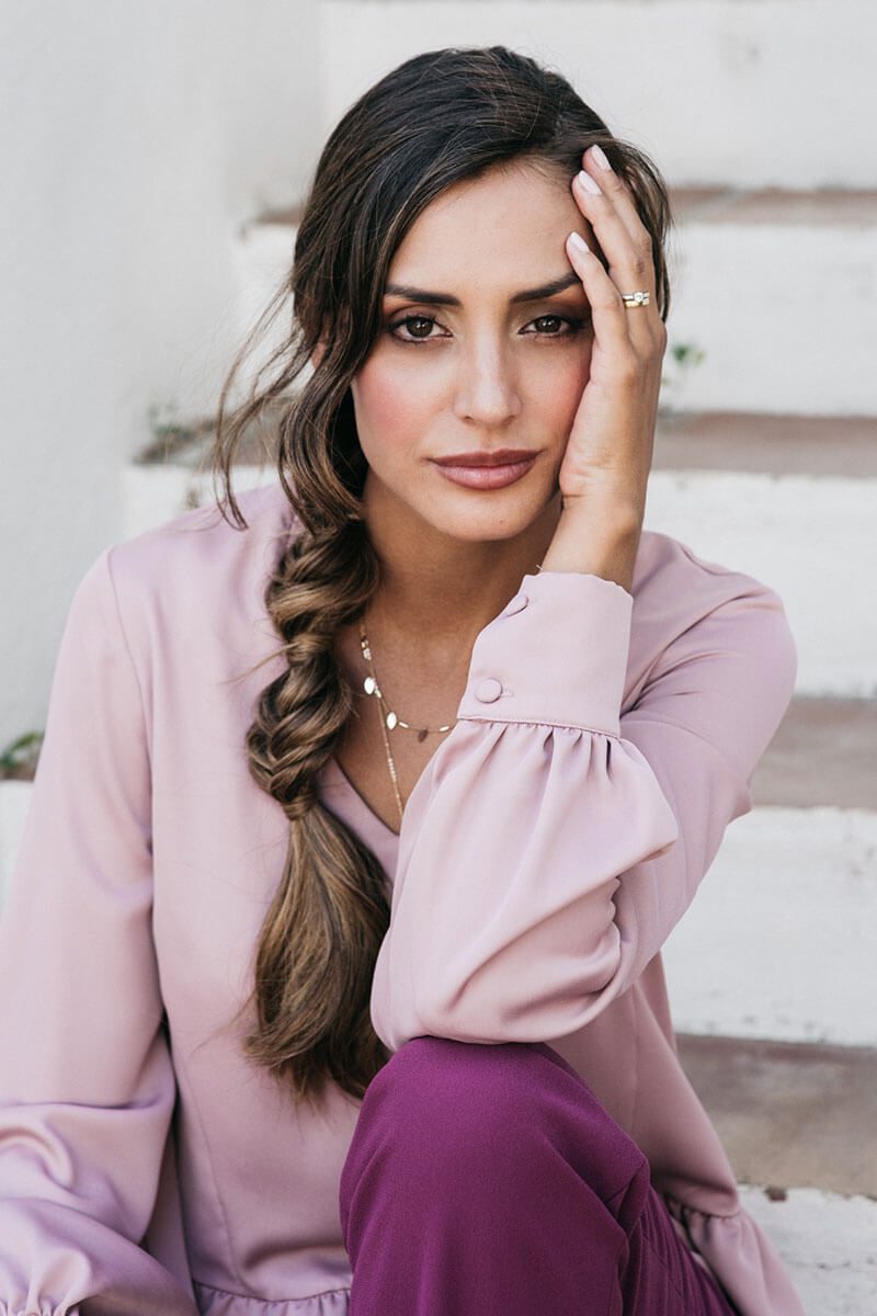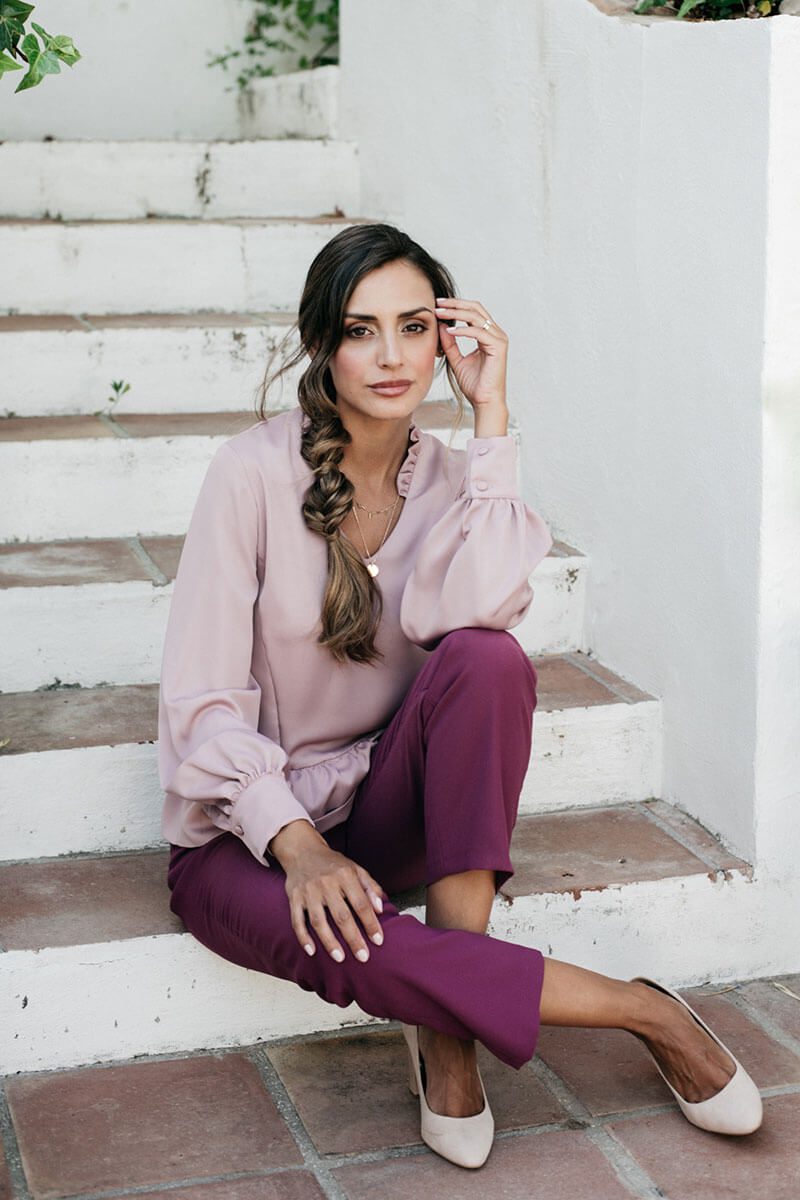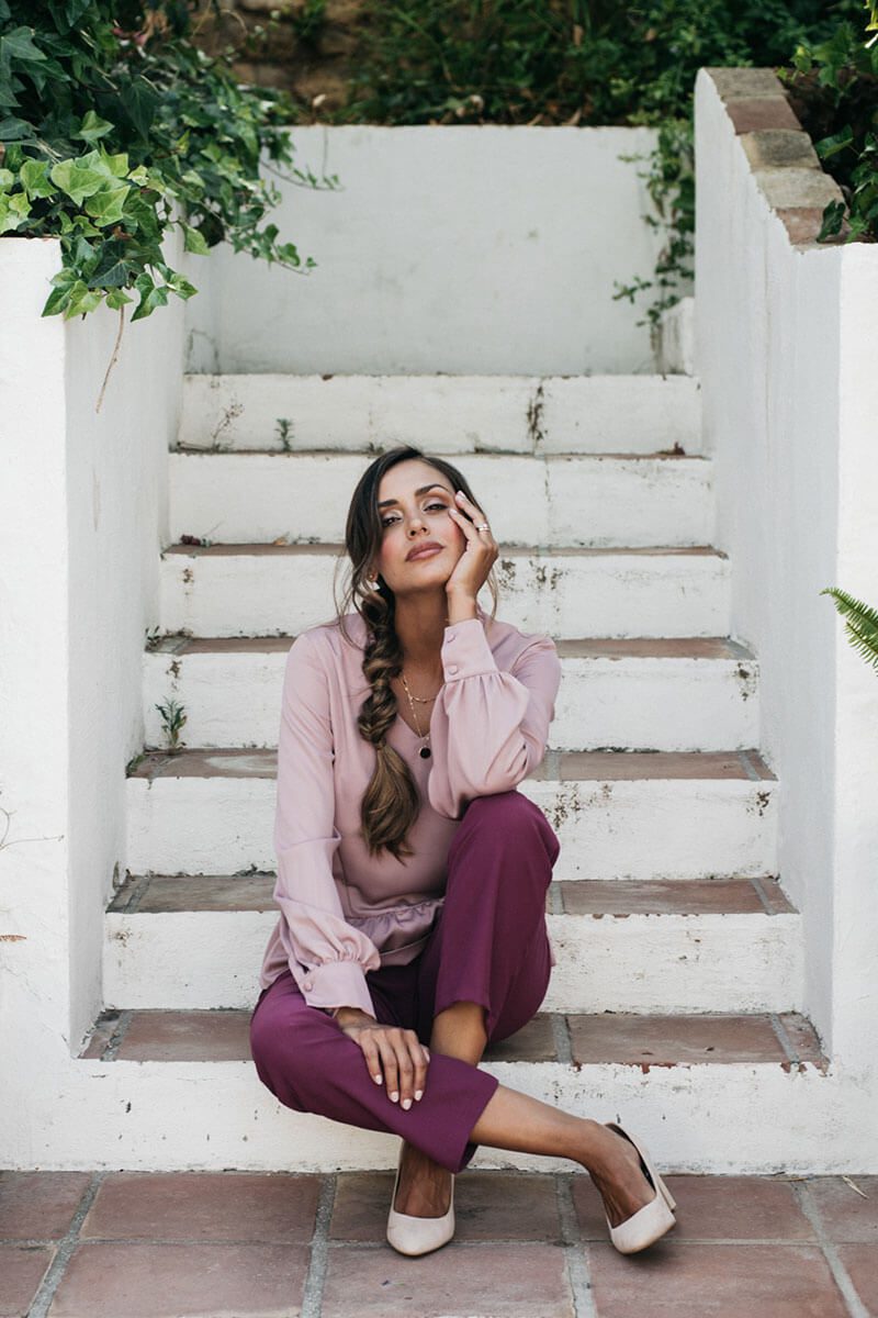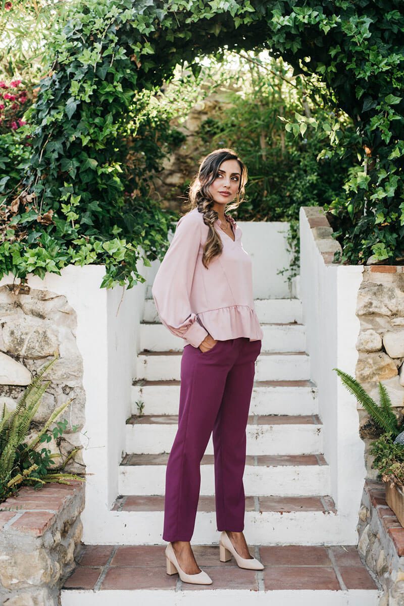 La blusa Feminity es suelta, de largo hasta la altura de las caderas, con manga larga y cuello de pico. Su escote en forma de “V”, además de ser el más favorecedor, está decorado con un volantito en versión mini que aporta un toque muy original a la prenda. Su manga es suelta, fluida y con volumen en la parte de abajo, donde termina con un puño de tejido doble que se cierra con dos botoncitos forrados del mismo tejido de la prenda. La blusa acaba con un volante rizado en el bajo lo que aporta aún más fluidez y soltura a la prenda.