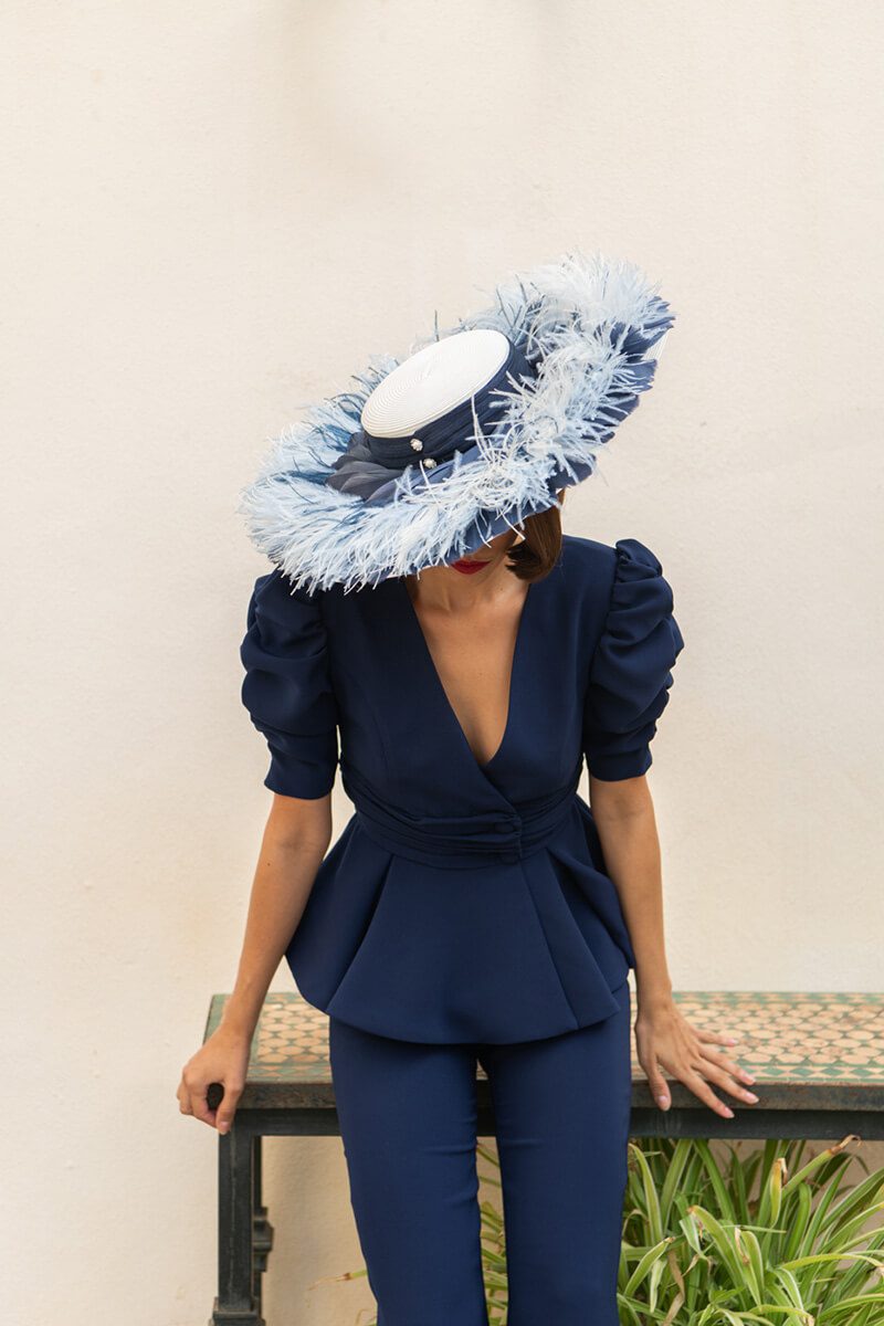 Conjunto de pantalón y chaqueta. La chaqueta va cruzada, con escote de pico, cinturilla con pliegues y se abrocha con dos botones forrados en el mismo color y tejido. Lleva manga al codo con un abullonado muy especial. La parte de abajo lleva volante con tejido doble de peplúm, más largo en la espalda que en el delantero. La chaqueta lleva una doble capa de tejido en la parte superior y va reforzada con una entretela especial.