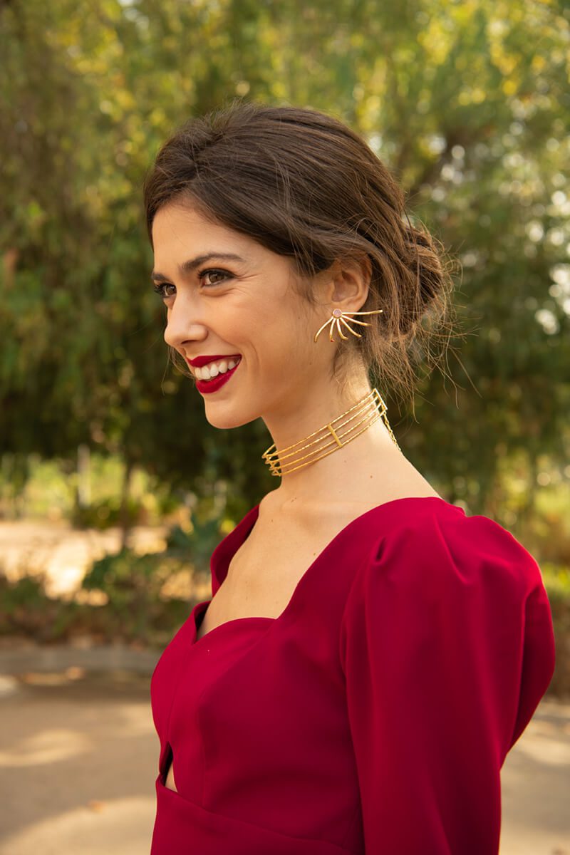 La parte superior del vestido lleva doble capa de tejido lo que aporta una gran sujeción en la zona del pecho. La falda lleva forro de punto de seda, lo que hace que se adapte al cuerpo, pero sin marcar. La forma de los pliegues, están estratégicamente pensados para realzar la figura.
