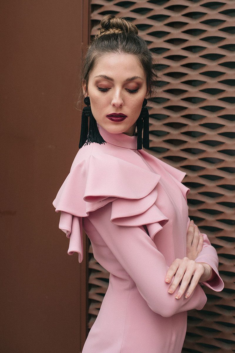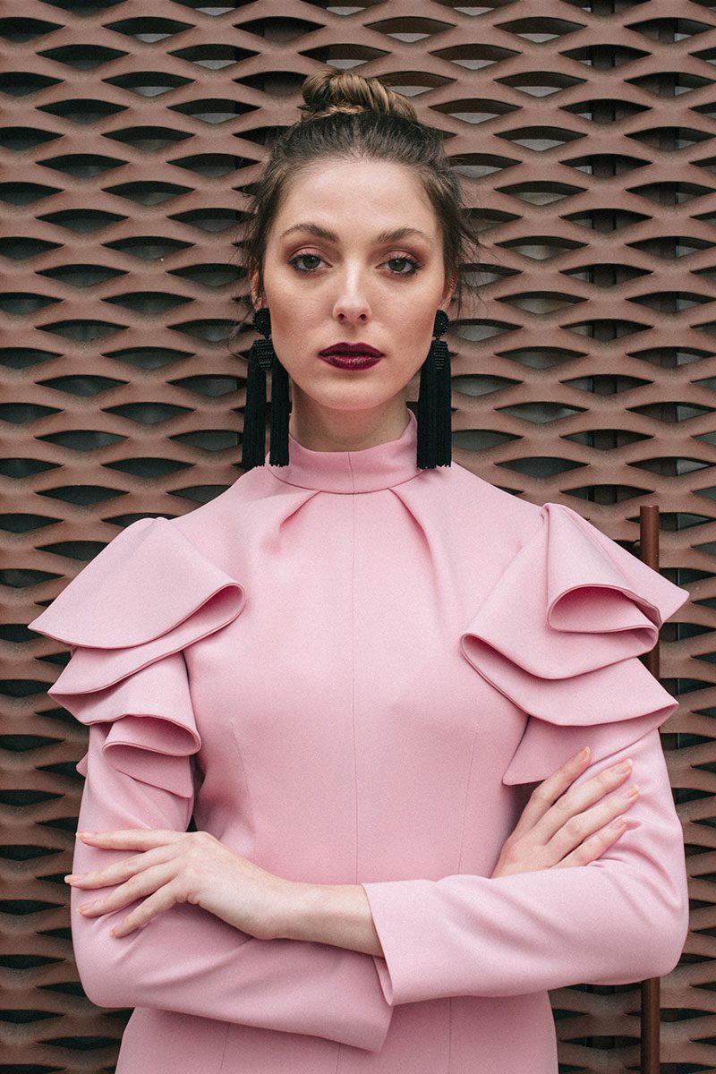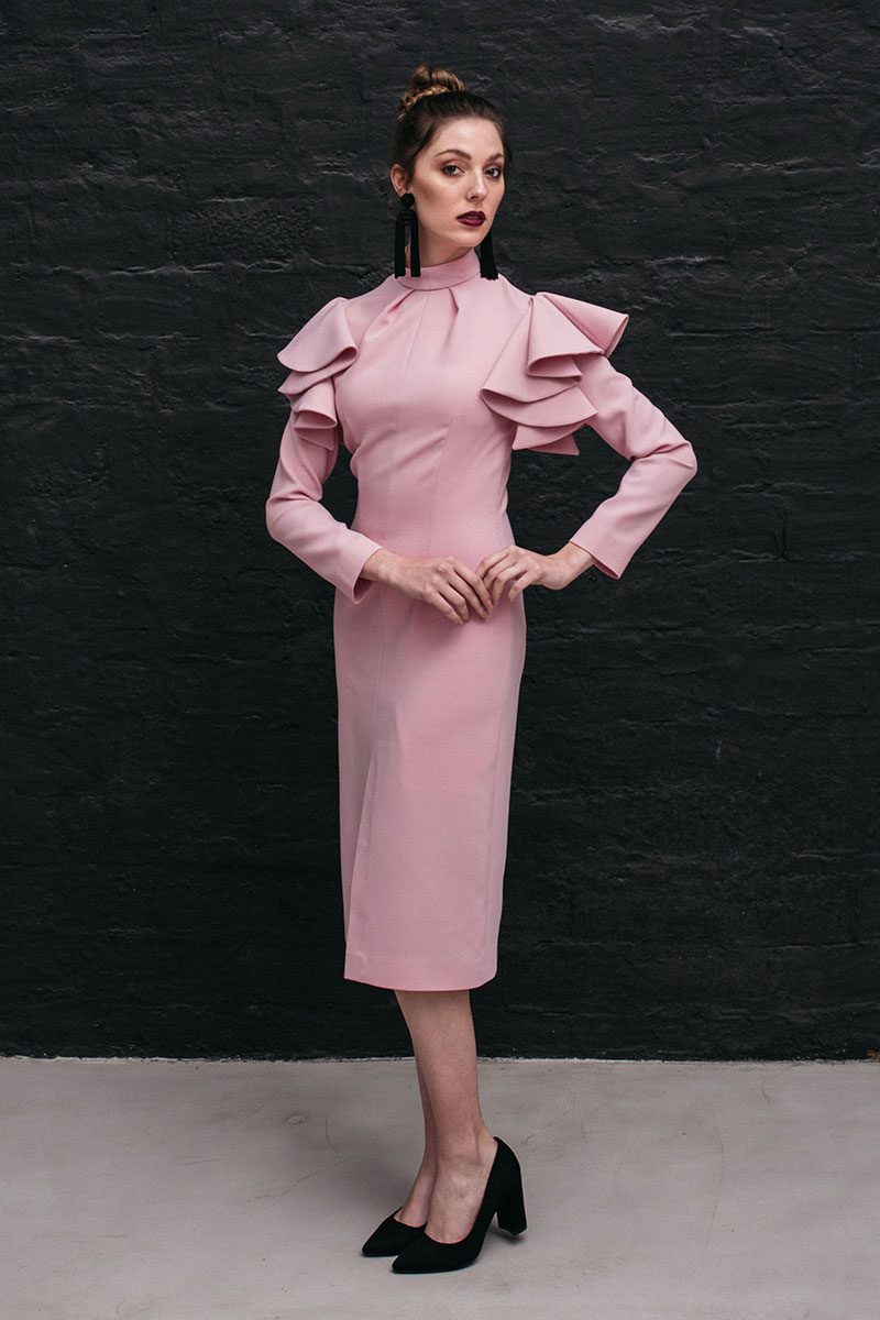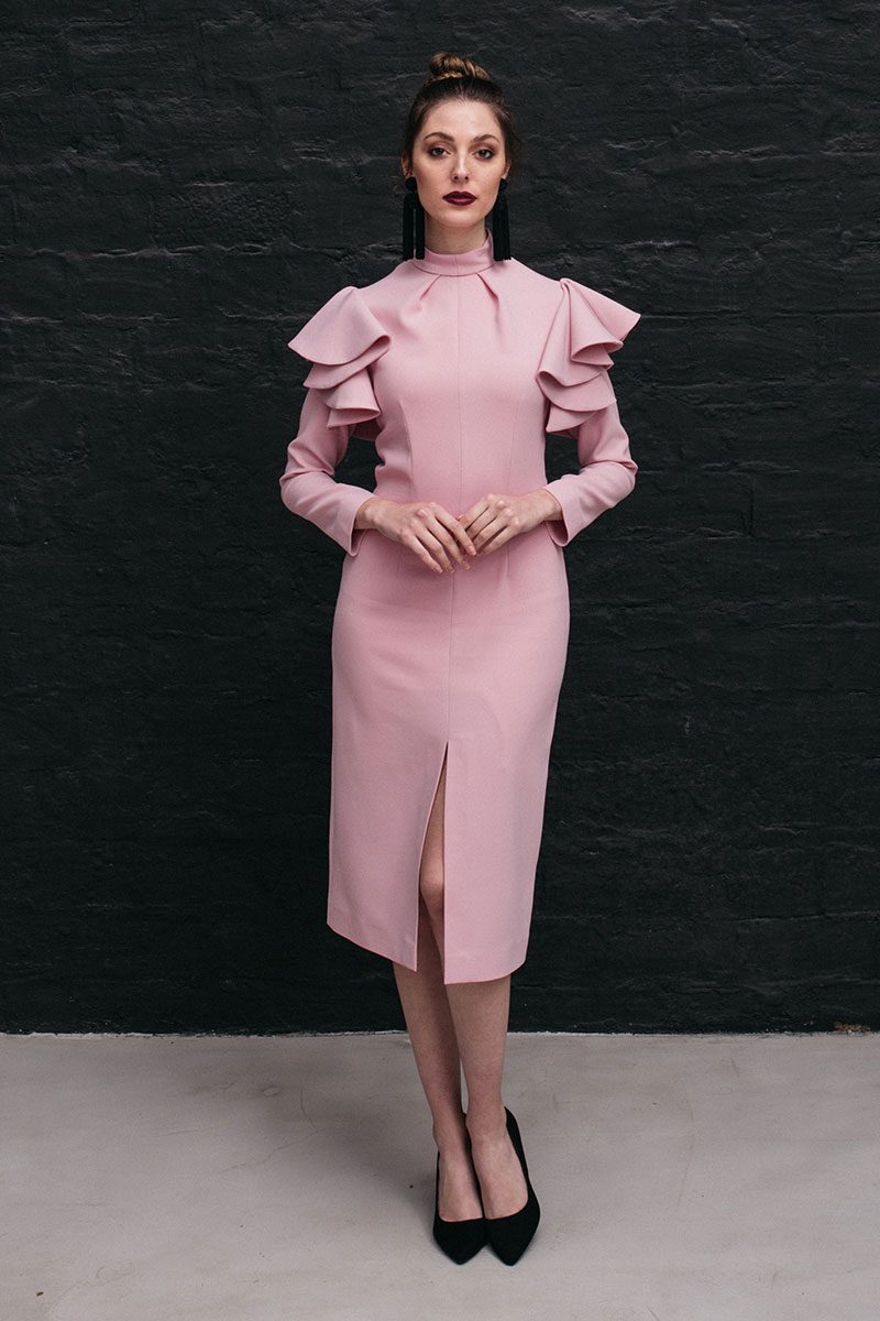 El vestido Beatrice Rose se abrocha con una cremallera invisible que lleva en la espalda y 2 botones pequeños forrados a mano en el cuello. Su manga larga está decorada por un volante en forma de capa, que junto a su cuello alto y su largo midi lo hacen muy especial.