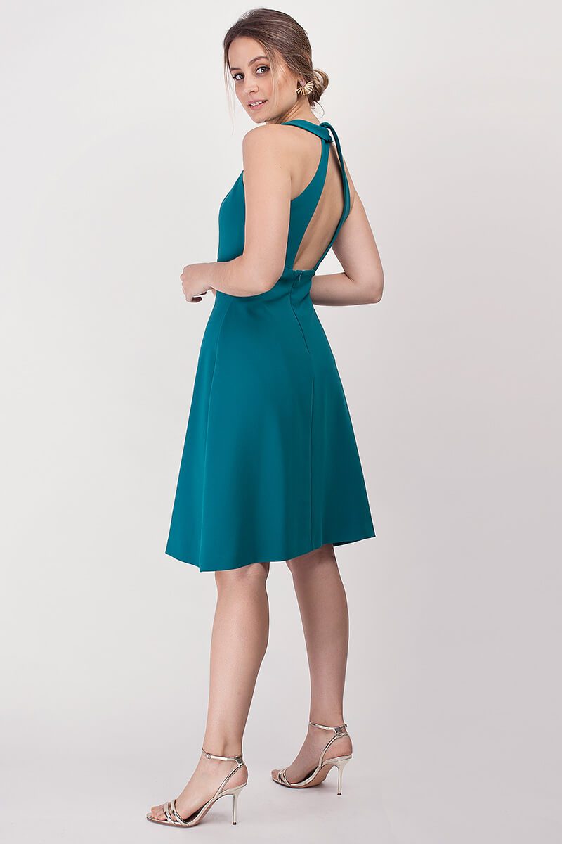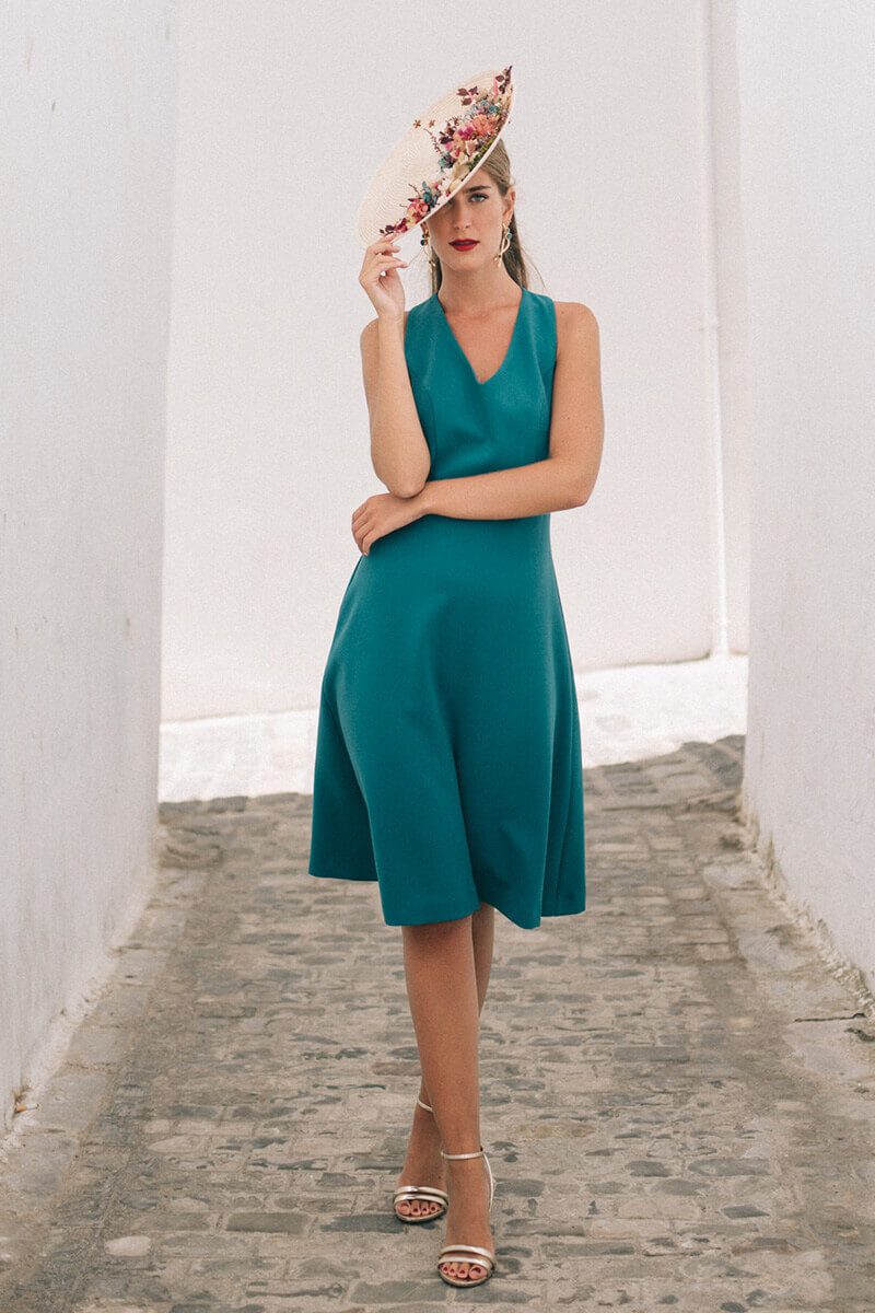 La forma del vestido es semi fluida, quedando un poco más entallado por la parte superior del cuerpo que por la falda. Su largo es por debajo de la rodilla, y su falda va cortada en forma de “A” lo que resulta de lo más favorecedor. En el delantero su escote es en forma de pico y en la espalda lleva un escote abierto con un diseño muy original abrochoado con dos pequeños botones forrados que leva en la zona del cuello.