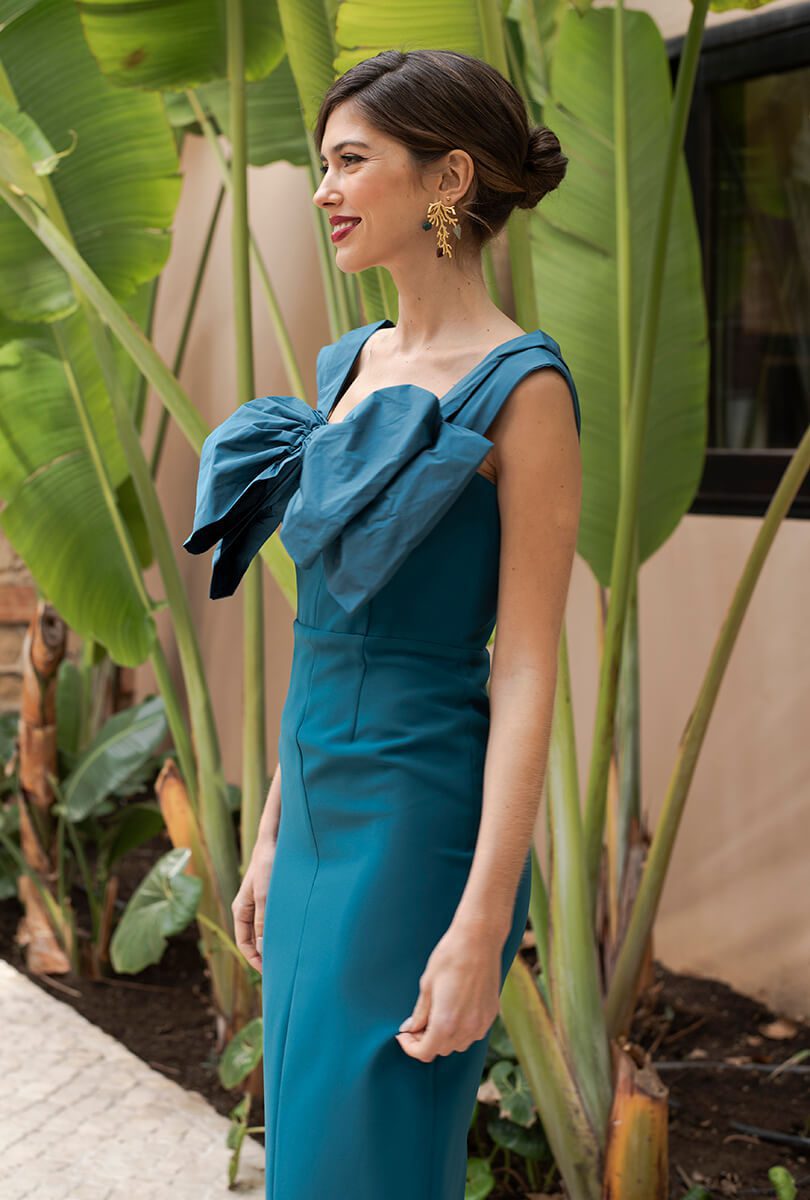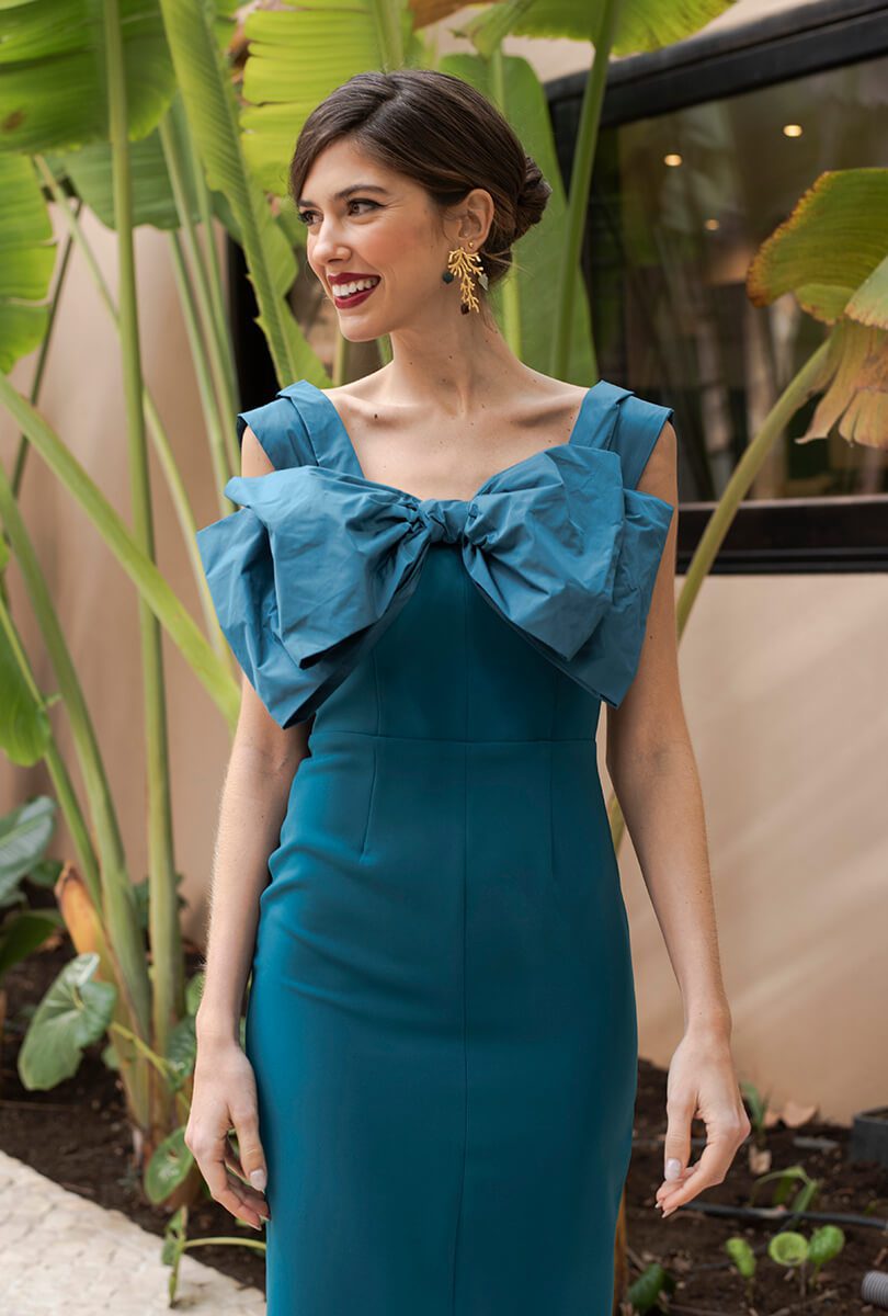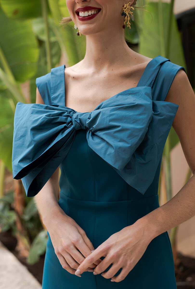 Vestido Midi entallado con detalle de doble lazada y tirantes en tafetán. Lleva forro, va entretelado, abertura en la falda y se cierra con cremallera. Elige la talla que suelas usar habitualmente en otras prendas entalladas no elásticas o deportivas. También puedes enviarnos tus medidas al WhatsApp +34 695499062 y te ayudaremos a elegir tu talla ideal.