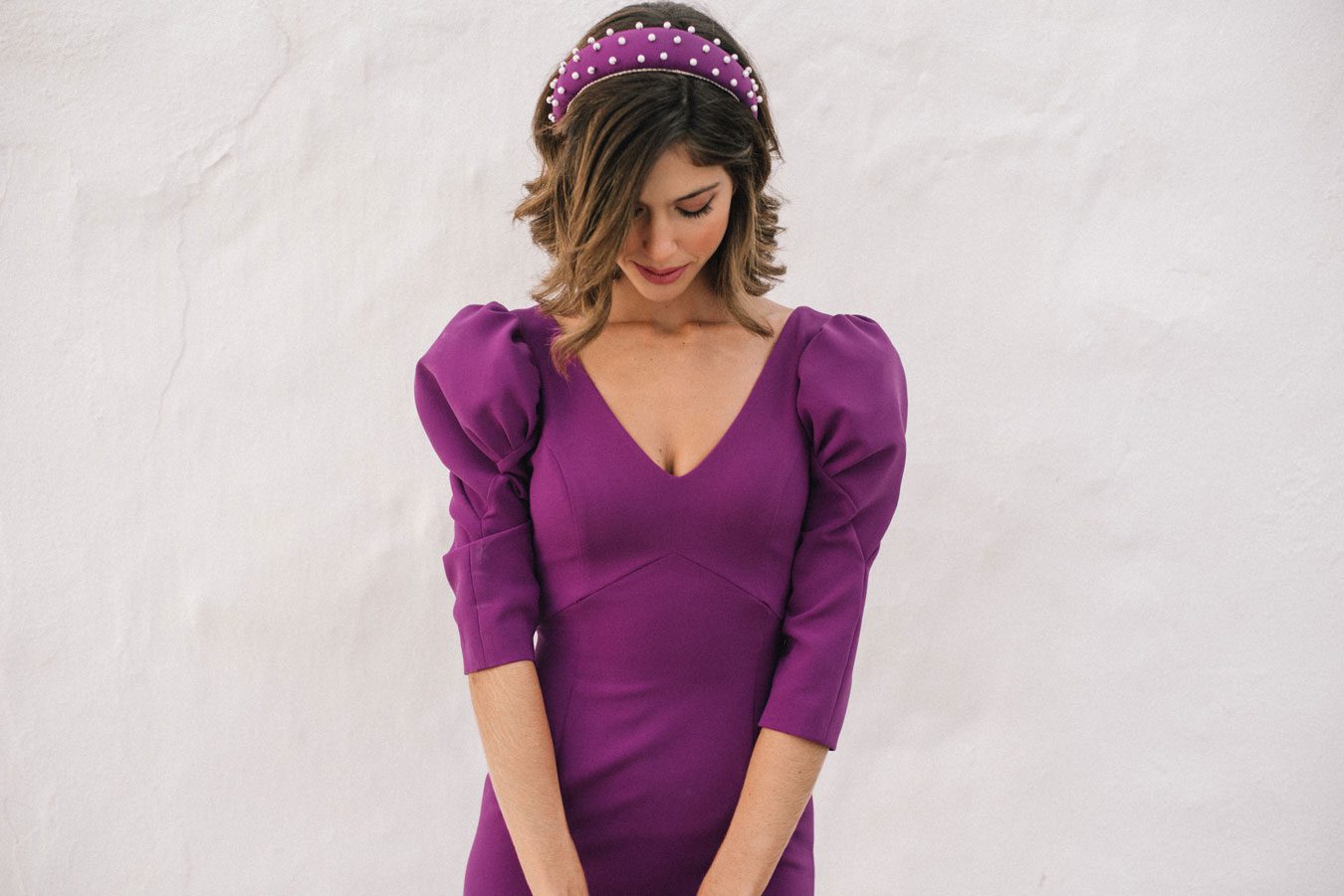 Vestido corto entallado. Lleva escote en forma de pico y manga francesa con detalle especial de abullonado y pliegues en la parte de arriba, que va reforzada con un tul especial en su interior para que aporte más volumen. Escote en forma de pico en la espalda, decorado con detalles de botones en versión mini, forrados en el mismo tejido y color que el vestido. Se cierra con una cremallera invisible que lleva en el centro de la espalda. La parte superior del cuerpo lleva una doble capa de tejido y va reforzada con una entretela especial. La falda va forrada con forro de punto de seda.