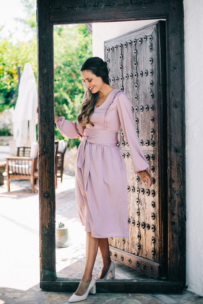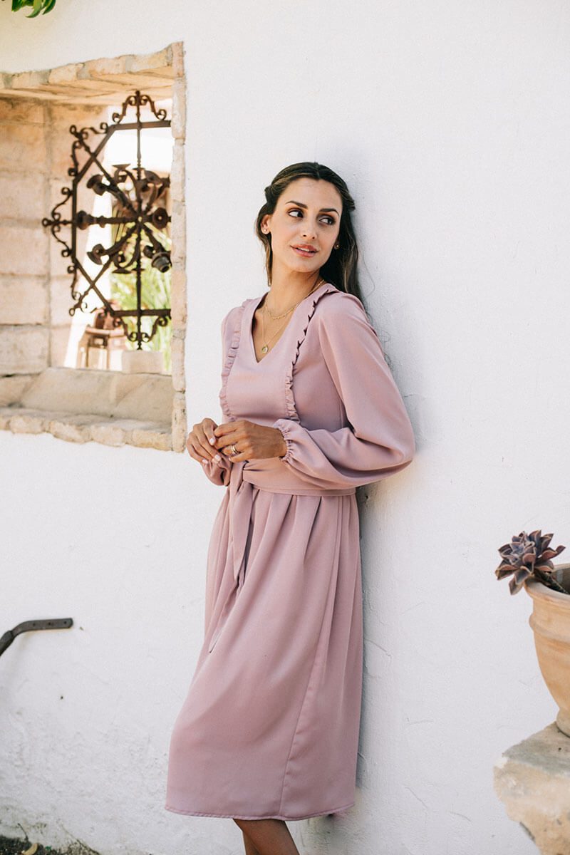 El vestido “Your Passion” es semientallado, de manga larga y largo midi, con escote en forma de pico. El escote en forma de “V” resulta de lo más favorecedor ya que estiliza muchísimo nuestra figura. El cuerpo va decorado con volantitos en versión mini dándole un toque muy especial y delicado. La manga es larga, con volumen y rizo en el puño que termina con una cinta elástica muy fácil de adaptar si se quiere llevar a modo de manga francesa o al codo. La falda es suelta y fluida, lo cual lo convierte en el vestido perfecto para disimular caderas y el detalle del cinturón con lazada le da un toque de lo más elegante y sofisticado.